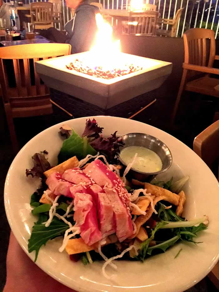 Today we enjoyed the Ahi salad which was seared to absolute perfection over arugula & mixed greens, with dried cranberries, slivered almonds, with wonton strips for crunch. The wasabi dressing is one of kind and pairs perfectly with this light and enjoyable salad.