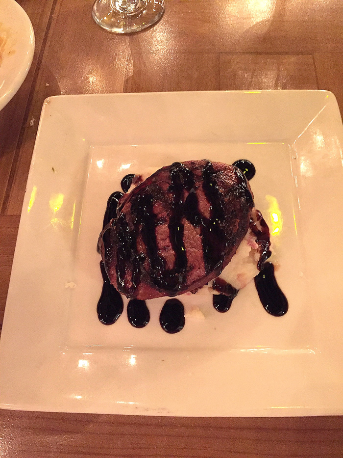 • The bacon wrapped filet mignon served over mashed potatoes with a balsamic sauce will certainly please your palate. The Filet was beautifully cooked and paired with tasty- good mashed potatoes. The plating presentation shows off Chris's culinary artistry and resonates his passion for his menu.