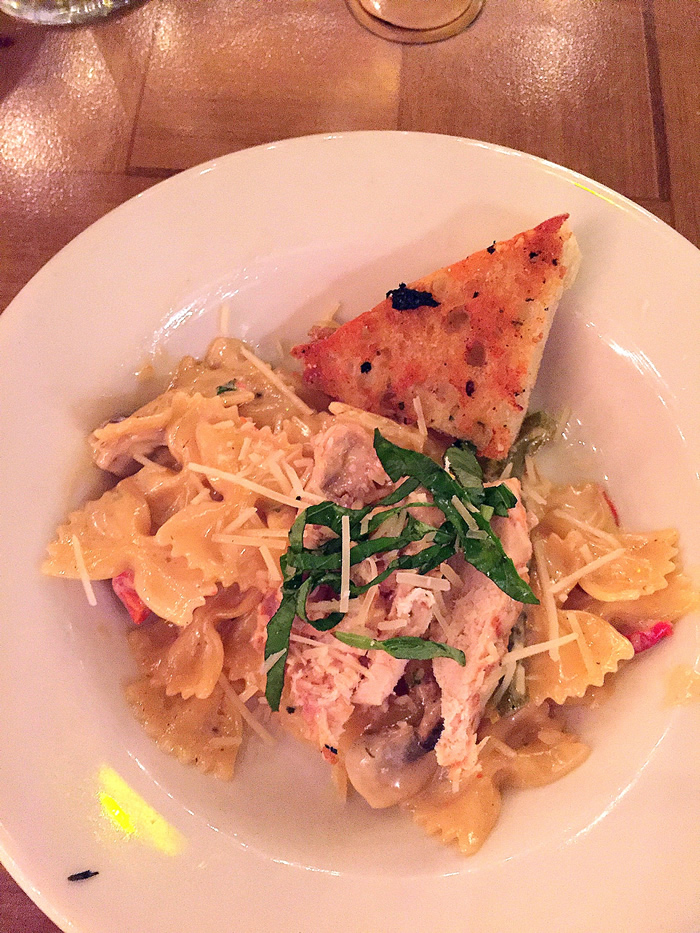 • The Chicken Milano featured perfectly cooked chicken breast over bow tie pasta, green onion, mushrooms, sundried tomato and fresh cut basil.