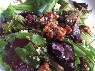 Our salad was newly introduced to the menu, the “Delta Blue”; hickory smoked bacon, glazed walnuts, crumpled bleu cheese, cranberries tossed with mixed greens in a house made dressing. A definite keeper, the Delta Blue was savory and refreshing, and made for a perfect afternoon salad. Serving size was very generous. Cost $10.99.