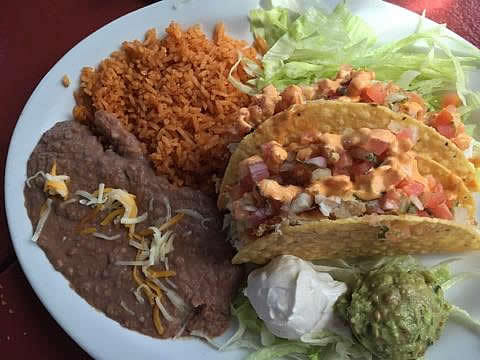 • Not being a fish taco fan, I wasn't sure I would even taste this: two crispy tacos with deep fried cod and pico de gallo, but this was one tasty fish with a spicy flair. I’m a fan! It was delicious. Our sides included hot rice and beans.