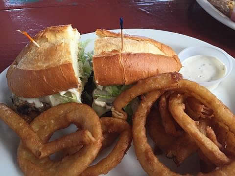 • The Juicy Burger was a huge half-pound event! Lean ground beef, grilled onions, garnished with lettuce, tomato, jalapenos, with Monterey jack cheese on a French roll, and a side of creamy Ranch dressing, for about $11.00. Nothing average here. Big portions, tons of flavor. Complimented with large onion rings, this was a winning combination.